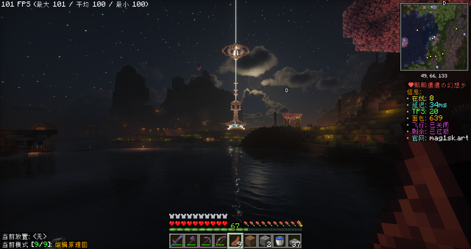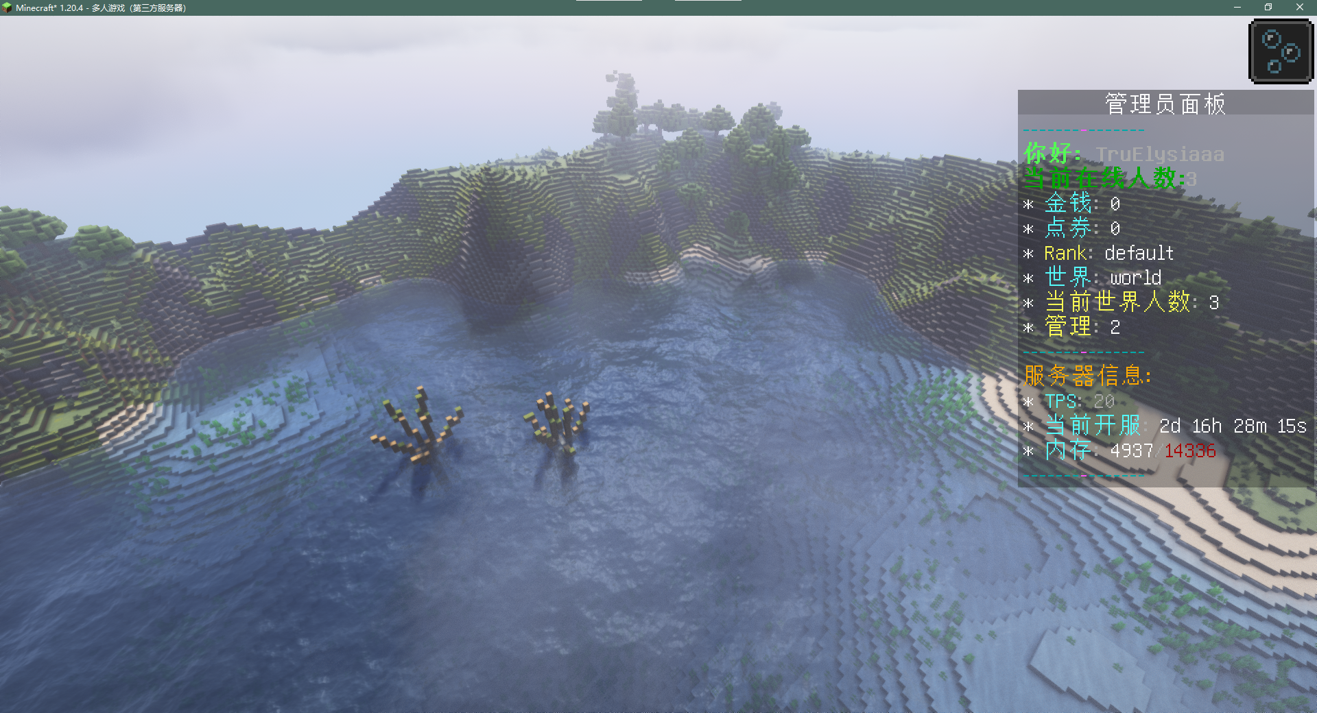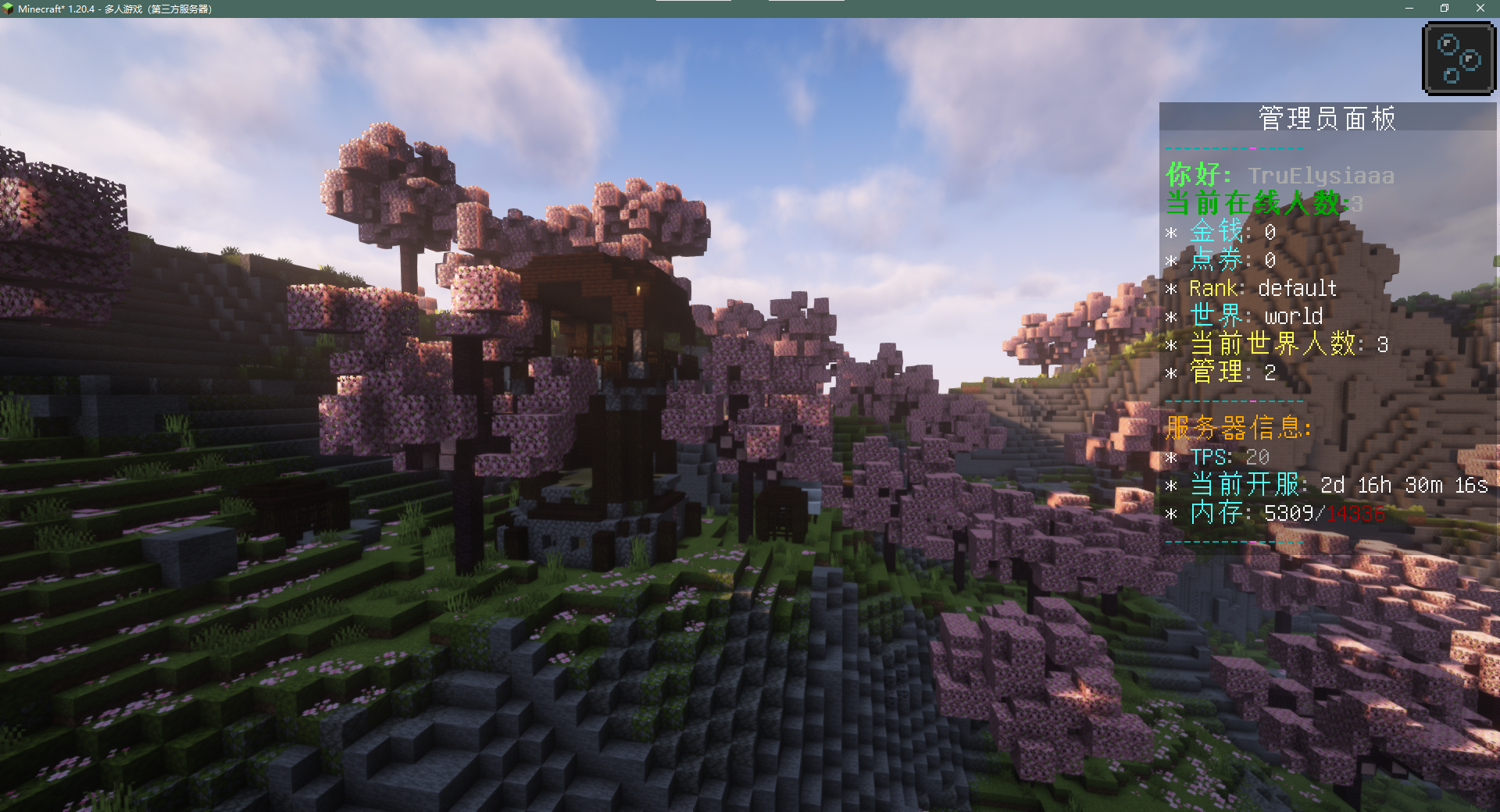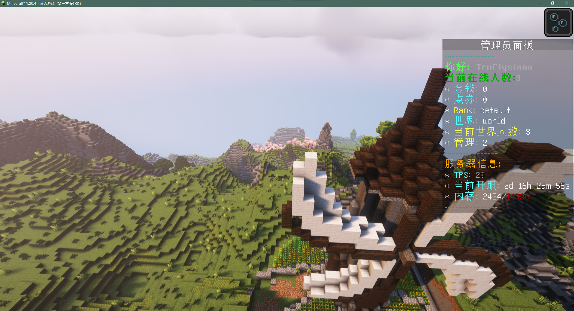 相比一周目,我为它添加了更多好玩的特性:粘液,生电,独立主城,MMORPG特性,更多附魔,武器,地牢以及优美的地形生成,动态难度BOSS,还有更多结构和玩法优化,还有单独的PVP/跑酷群服互联,一切为了玩家黏性和爽感服务。